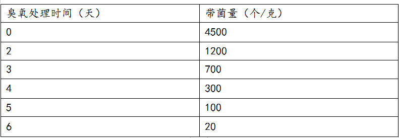 表:臭氧實倉防黴試驗過程中對微生物帶菌量的數量測定